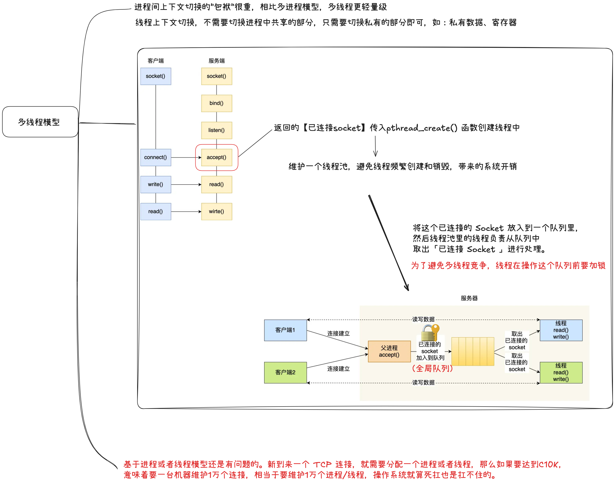 - 多线程模型。多个客户端,对应一台服务器上的一个进程的多个线程。一个客户端对应一个线程。