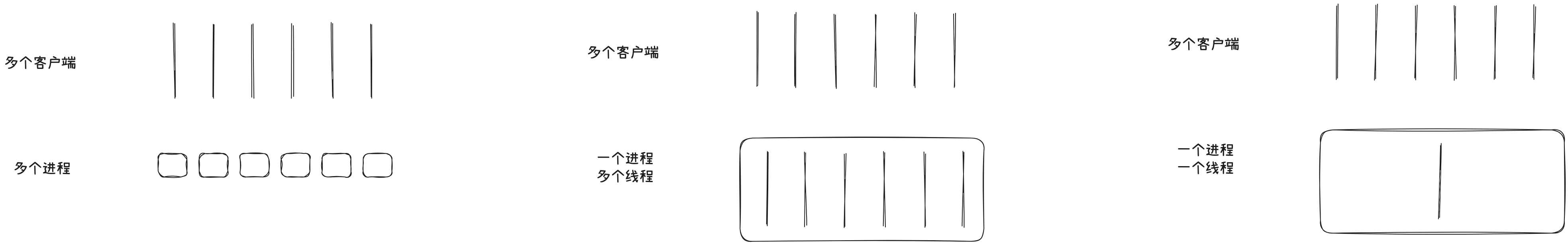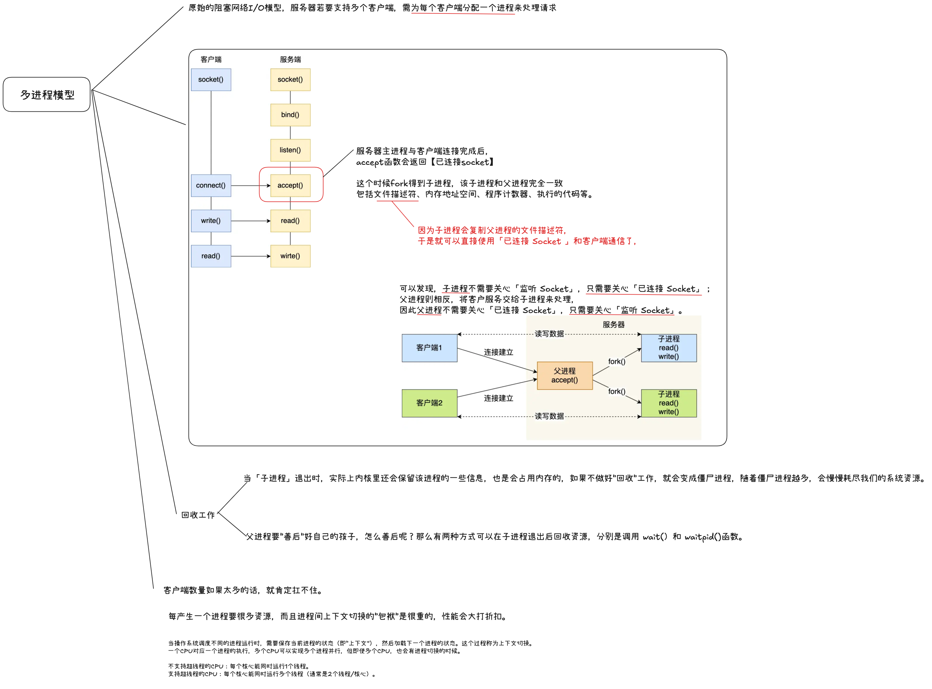 - 多进程模型。多个客户端,对应一台服务器上的多个进程。一个客户端对应一个进程。